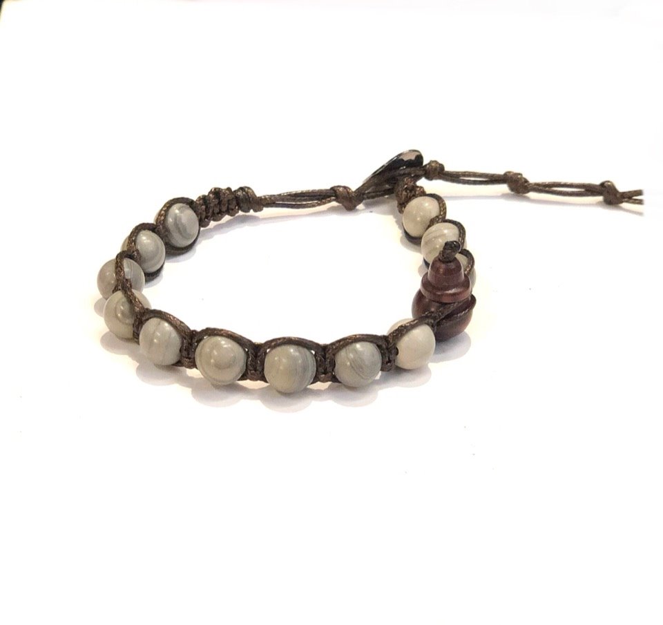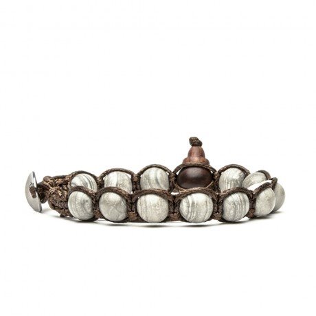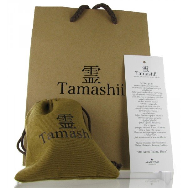 In Tibet i gioielli hanno un forte valore simbolico e tramandano valori culturali e religiosi antichissimi. Nella tradizione buddhista le gemme e i gioielli servono come metafore per gli ideali della fede ed esprimono misteriose condizioni spirituali e attributi interiori nascosti. Tamashii (o Shamballa) è un bracciale utilizzato dai monaci tibetani per favorire la meditazione, per le pratiche religiose e come talismano. Infatti Tamashii significa “anima” e il termine deriva da ‘tama’ che significa “gioiello”, quindi “gioiello dell’anima”. Chi lo indossa persegue un ideale di pace e di amore verso se stesso e verso il mondo, il bracciale aiuta a proteggere la sua anima, a farla crescere e farle trovare un ruolo ed un senso all’interno della vita. Prodotto realizzato in Tibet e benedetto da monaci buddisti. Pietra di questo tamashii è DIASPRO GRIGIO STRIATO