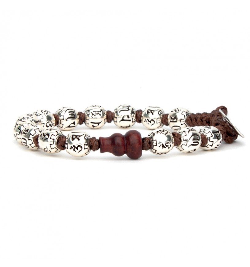 Braccialetto realizzato con cordino marrone e sfere in argento 925% dal diametro di 8 mm con inciso il mantra “Om Mani Padme Hūm”.