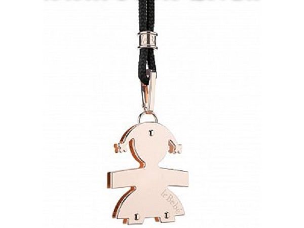 Ciondolo con sagoma femminuccia in oro rosa, altezza 1,4 cm · Larghezza 1,2 cm . Cordino color nero e distanziatore in oro rosa.