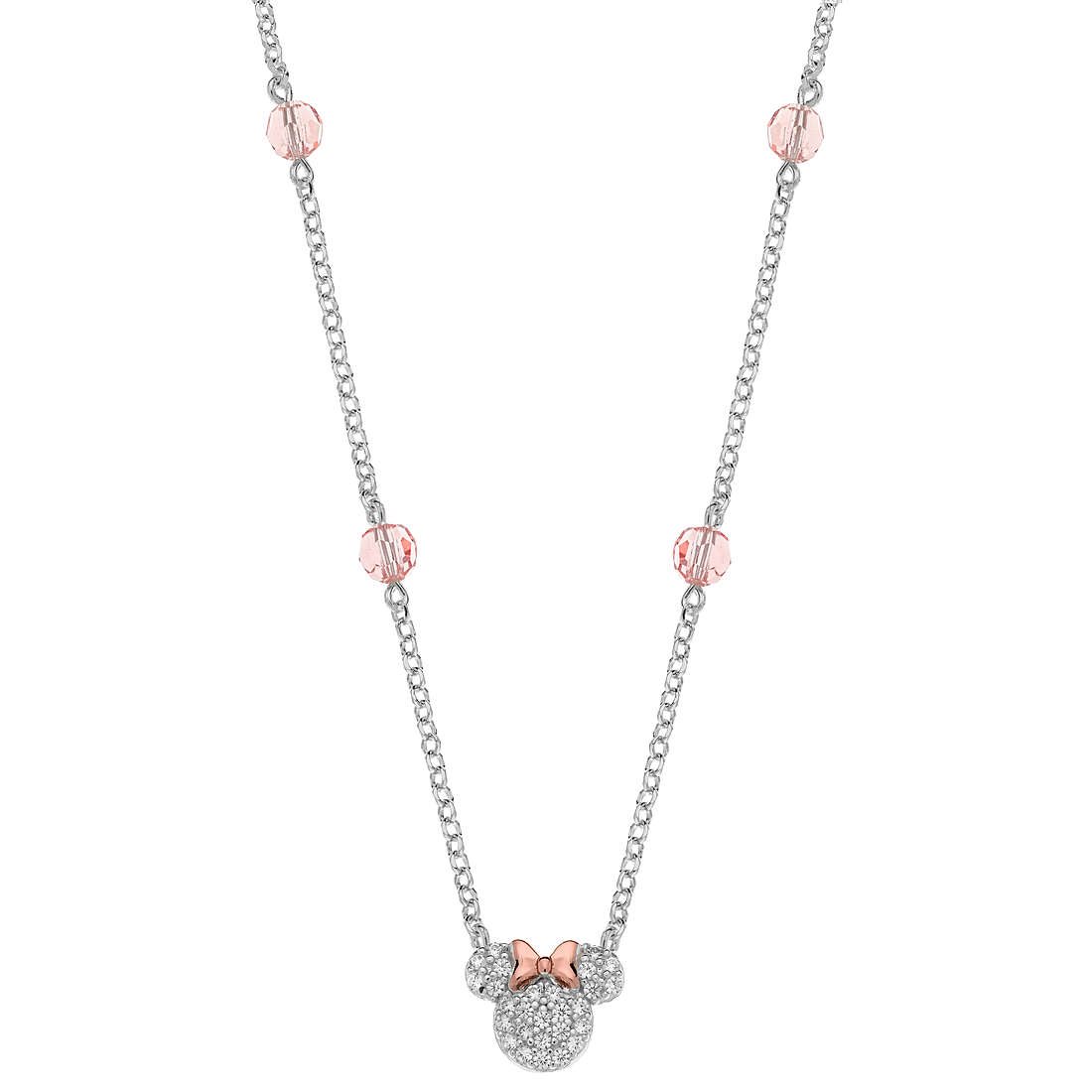 Collana Disney realizzata in argento 925 , con un centrale zirconi Bianchi raffigurante Minnie e riporti fiocchi in argneto rose’ e zirconi rosa. Questa collana è un regalo adatto alle bambine che amano Minnie. Lunghezza 40-43 cm e chiusura con anello a molla.