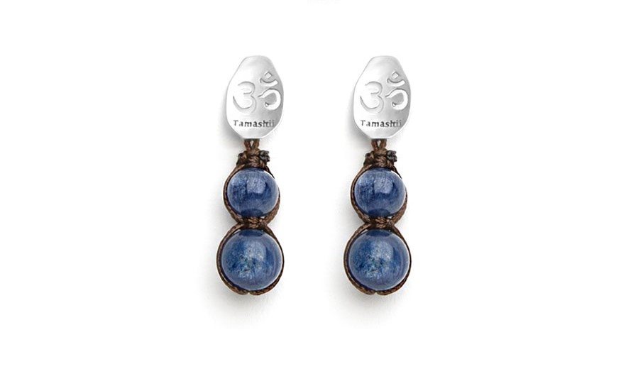 Coppia di orecchini originali Tibetani Tamashii® realizzati con pietre naturali di Cianite e cordoncino marrone.