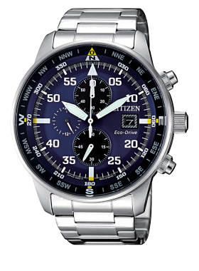 Orologio cronografo Citizen modello AVIATOR CHRONO. Cassa in acciaio spazzolato e lucido, fondo serrato a vite, ansa 22 mm. Movimento Eco-Drive a carica luce con riserva di carica a 270 giorni. Cronografo a 1/5 di sec. fino a 60 minuti. Vetro minerale. Qaudrante blu , lancette luminose – data ore 3. Lunetta nera con indicatore punti cardinali. Bracciale regolabile in acciaio spazzolato con chiusura déployante con pulsanti. Impermeabile 10 atm(WR 10 bar). Garanzia 2 anni.