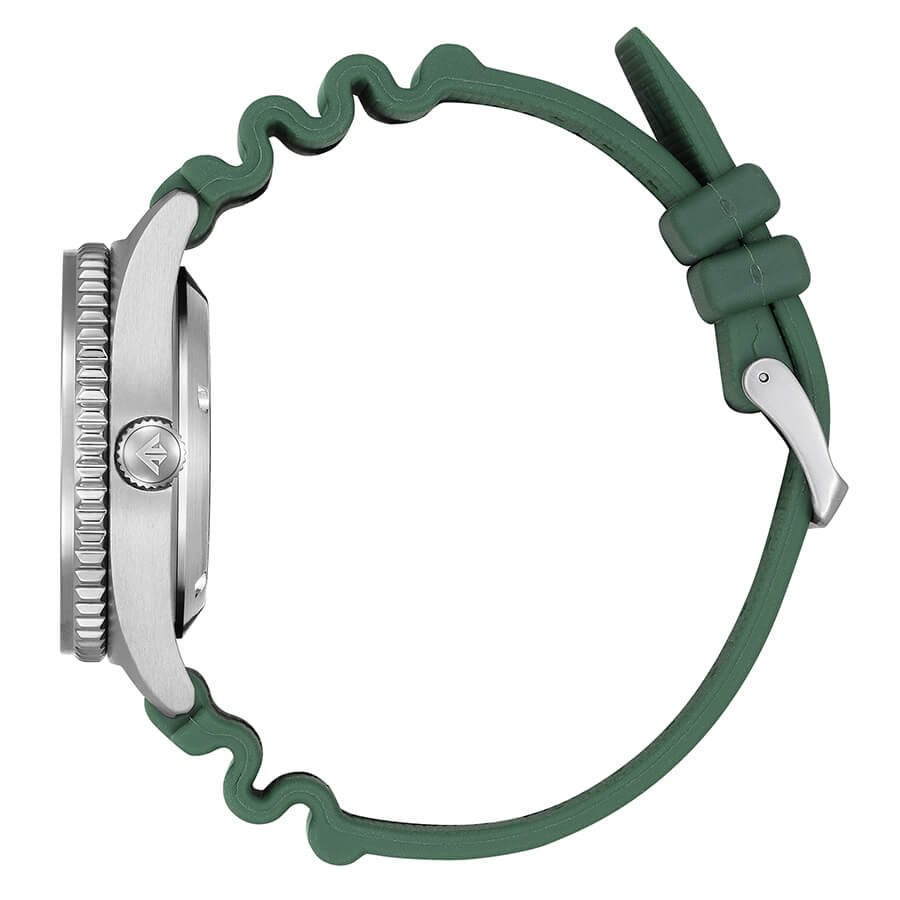 Orologio Solo Tempo Collezione Citizen Promaster Automatic Diver’s 200 mt.(certificato ISO).Cassa in acciaio spazzolato con ghiera unidirezionale verde, fondo e corona serrati a vite. Movimento meccanico automatico day-date Citizen cal.8204 riserva di carica 42 ore 21600 a/h e ferma secondi. Quadrante verde, indici e lancette ad alta luminosità. Vetro minerale ad alta resistenza. Cinturino in gomma verde fibbia con ardiglione in acciaio. Impermeabile 20 bar (20 atm.) Scatola (bombola) e garanzia 5 anni originali.