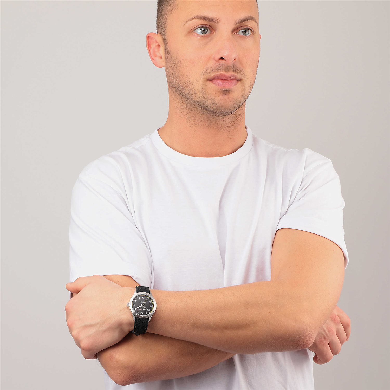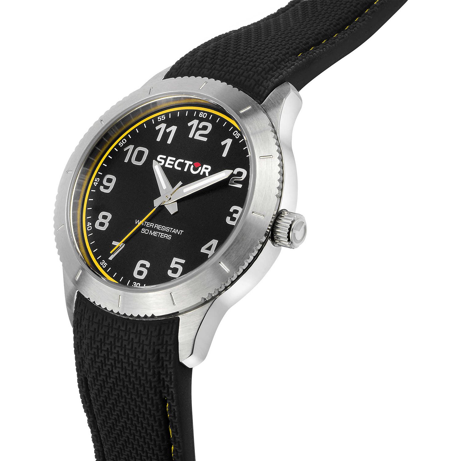 Orologio Solo Tempo Da uomo Di Sector Della Collezione 270. Orologio Con Cassa In Acciaio Della Dimensione Di 37Mm. Il Cinturino È In Silicone Nero E Giallo E Il Quadrante È Di Colore Nero E Giallo Con Il Vetro Minerale. Modello Con Movimento Al Quarzo E Resistenza All’Acqua Di 5 Atm.
