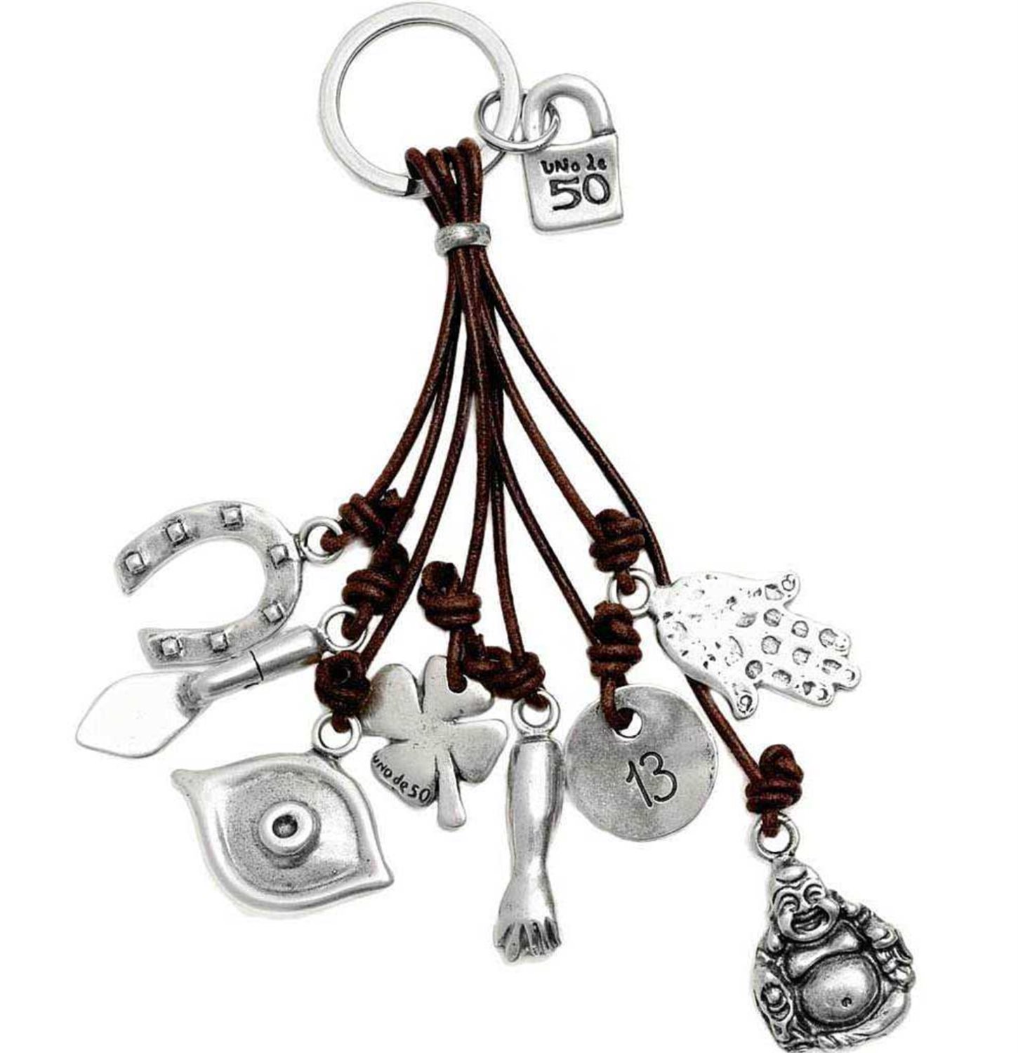 Portachiavi in cuoio con amuleti e il lucchetto di UNOde50, in bagno d’argento. Collezione: Amuleto. Referenza:LLA0124MTX.